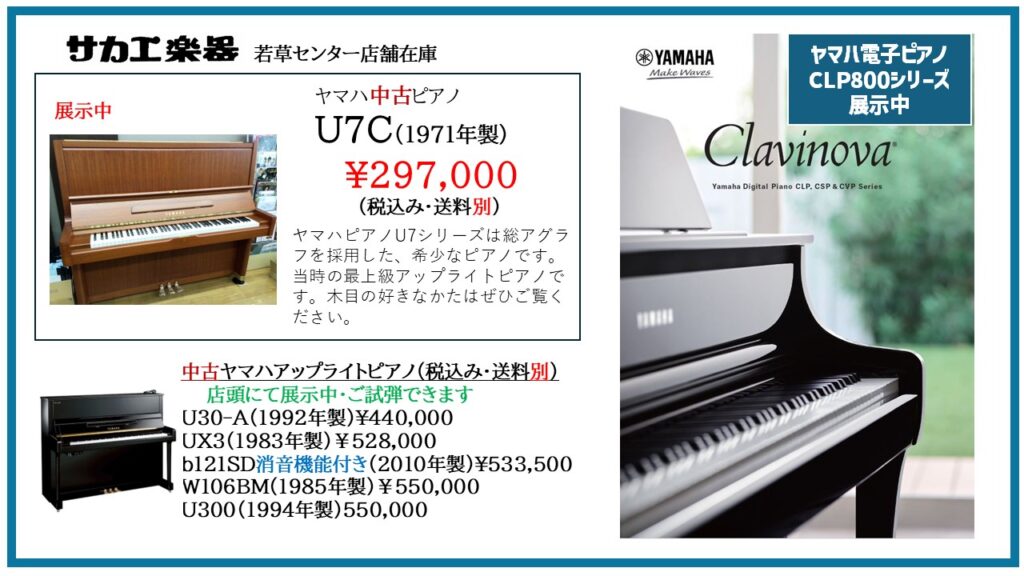 サカエ楽器 若草センター1F店舗にはヤマハのアコースティックピアノ、