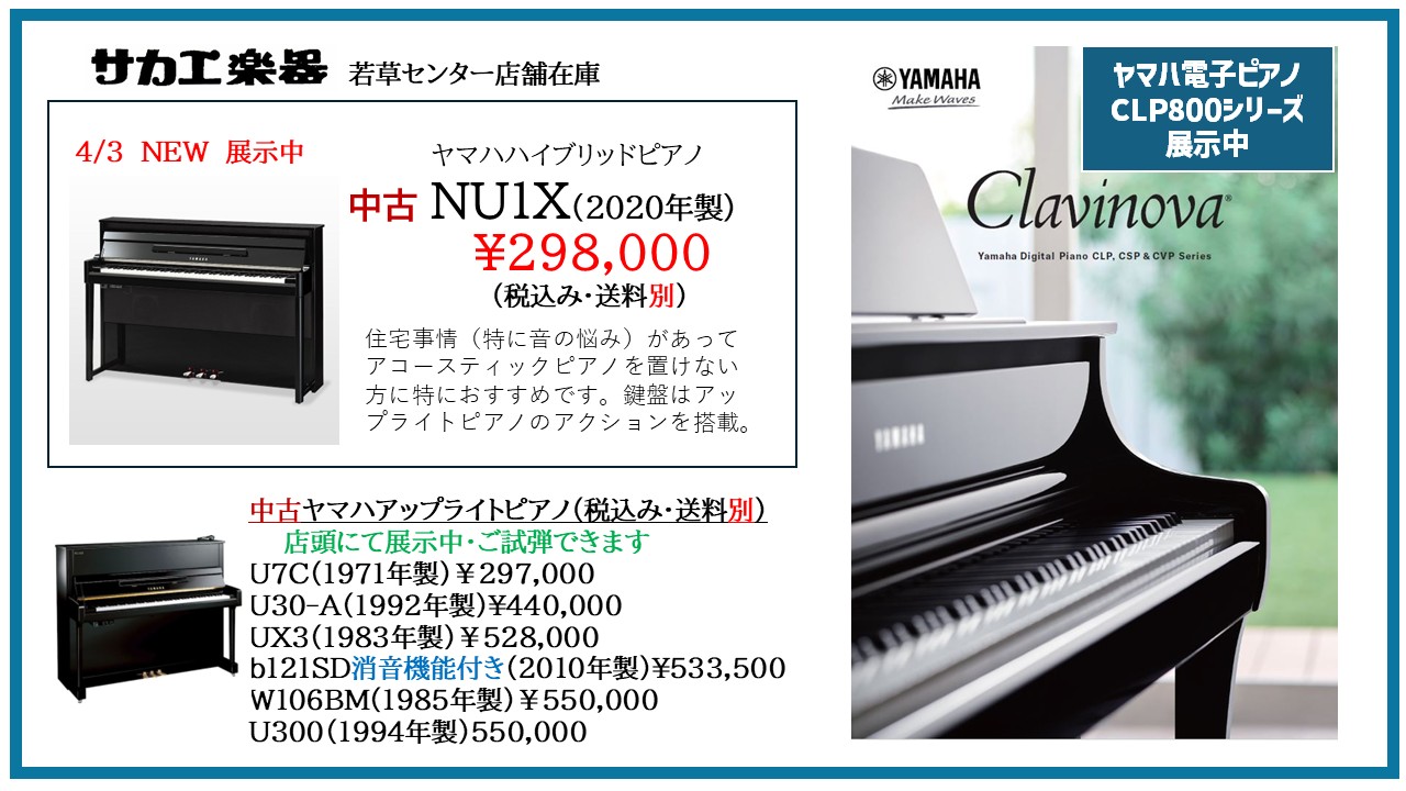 サカエ楽器 若草センター1F店舗にはヤマハのアコースティックピアノ、